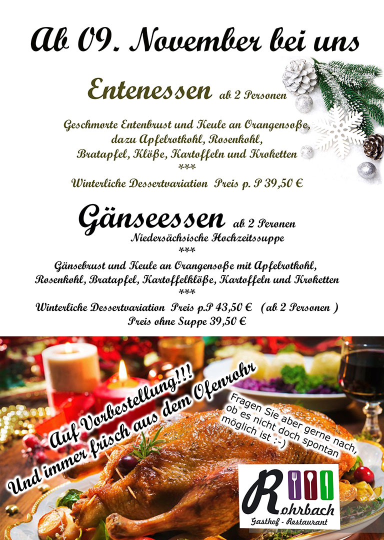 Genießen Sie ab 21.11. immer freitags ab 18 Uhr bei uns eine tolle Auswahl von Gerichten aus aller Welt: Gans, Ente und Weihnachtliches...