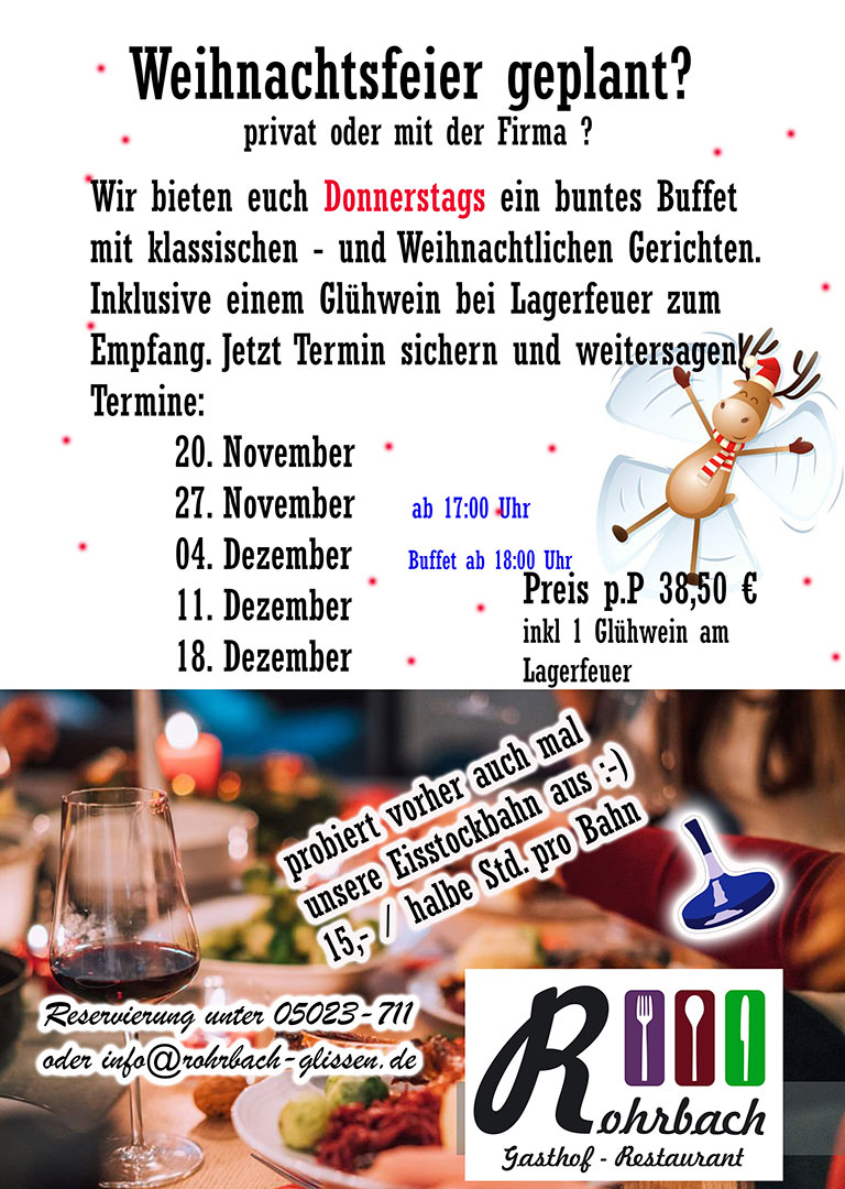 Reservierung: 05023-711 oder info@rohrbach-glissen.de